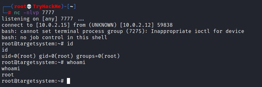 As our current user can access this script, we can easily modify it to create a reverse shell, hopefully with root privileges. The script will use the tools available on the target system to launch a reverse shell. Two points to note;