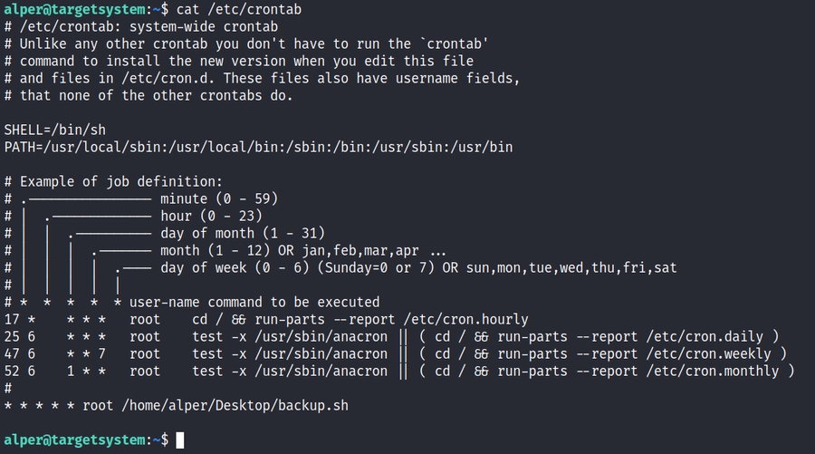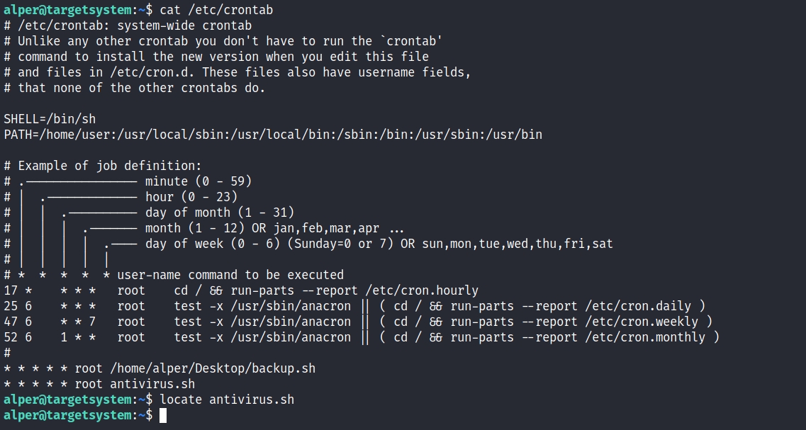 The example above shows a similar situation where the antivirus.sh script was deleted, but the cron job still exists. If the full path of the script is not defined (as it was done for the backup.sh script), cron will refer to the paths listed under the PATH variable in the /etc/crontab file. In this case, we should be able to create a script named “antivirus.sh” under our user’s home folder and it should be run by the cron job.