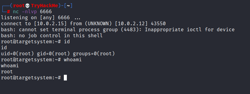 The incoming reverse shell connection has root privileges: